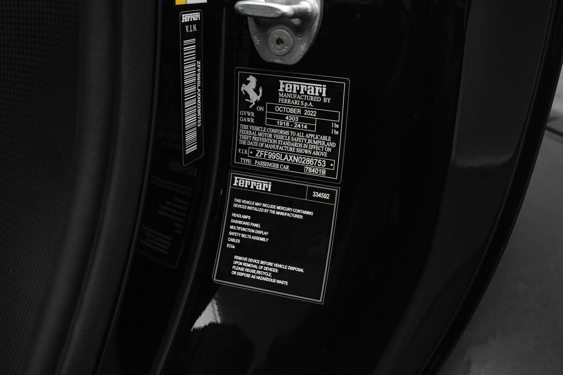 FERRARI OF CENTRAL NEW JERSEY IS PROUD TO PRESENT THIS BEAUTIFUL 2022 Ferrari 296 GTB 296 GTB, Nero with Terra Bruciata. Factory warranty is good till 02/15/2026. FACTORY OPTIONS: External colors : NERO DS 1250 Internal colors : TERRA BRUCIATA ALLUMINUM BRAKE CALIPERS TITANIUM WHEEL BOLTS HIGH-PERFORMANCE TYRES FORGED MATT DIAMOND WHEELS RACING LIVERY ASSETTO FIORANO FRONT PARKING SENSORS 'SCUDERIA FERRARI' SHIELDS ELECTROCHROM. EXTERIOR MIRRORS BACK RADAR ADVANCED FRONT DRIVING CAMERA COLOURED SPECIAL STITCHING DAYTONA RACING SEATS HORSE STITCHED ON HEADREST RACING SEAT LIFTER CARPETS BLACK LEATHER / ALCANT COLOURED SAFETY BELTS DAYTONA SEAT ALCANTARA STRIPES LEXAN REAR BONNET COVER COLOURED MATS WITH LOGO COLOURED STEERING WHEEL DEDICATION PLATE IN SILVER FIORANO PACKAGE EXTENDED APPLE CARPLAY CARBON STEER.WH. +PADDLES+LEDS Ferrari Approved Details: